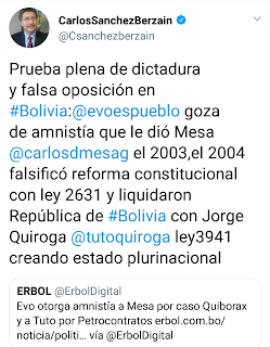 (annnoticias.ml) En un twit publicado el actual exiliado político y ex autoridad, señaló las acciones que permitieron que Evo Morales se salve de un proceso judicial por ser parte del grupo de derrocadores del gobierno de Gonzalo Sánchez de Lozada en la gestión de Carlos D. Mesa y la negociación de una constituyente que destruyó a la República de Bolivia por el Estado plurinacional del régimen masista. Cuando Quiroga fue líder de PODEMOS partido de oposicion en la primera gestion de Evo Morales.